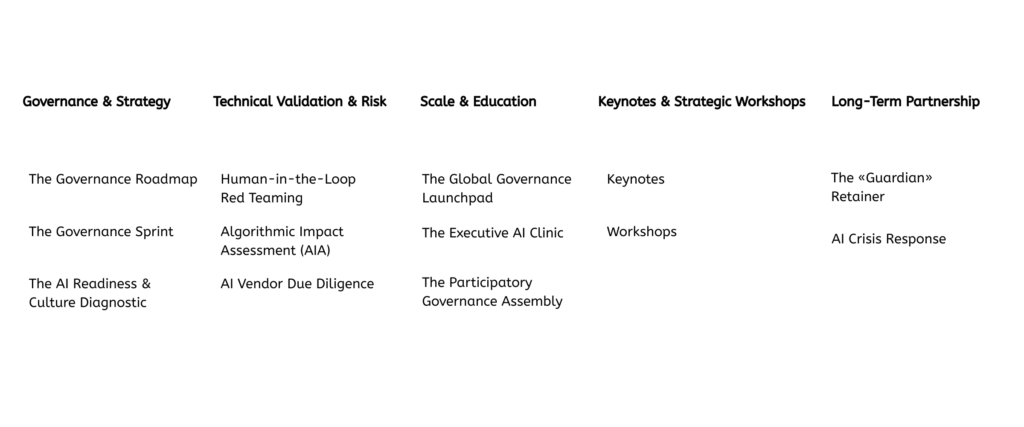 Helping organizations move from high-level principles to operational safety. These engagements create the cultural and structural foundation for responsible AI use.